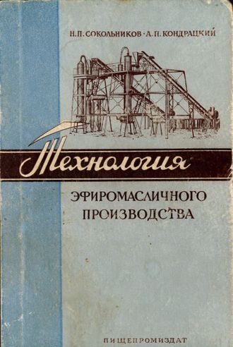Сокольников Н.П., Кондрацкий А.П. Технология эфиромасличного производства. М.: Пищепромиздат, 1958. 201, [1] с., ил.; 22,5 см. Библиография: с. 200 (19 наим.). Переплёт. Тираж 2 000.